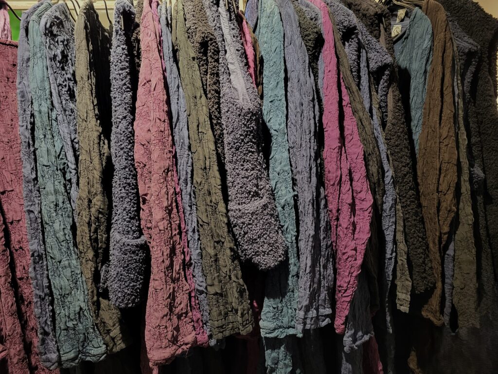 Hochwertige chinesische Seiden, Baltische Leinen und indische Bio Baumwolle lassen wir nach eigenen Entwürfen versteppen und besticken. So sorgen wir für lebhafte Texturen und den unverkennbaren Charakter unserer Materialien.